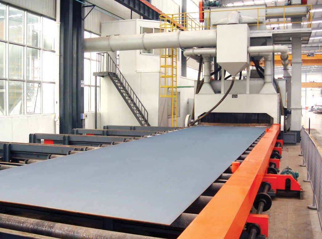 鋼材預處理線是指鋼材在加工前(即原材料狀態)進行表面拋丸除銹并涂上一層保護底漆的加工工藝。鋼材經過預處理可以提高機械產品和金屬構件的抗腐蝕能力,提高鋼板的抗疲勞性能,延長其使用壽命;同時還可以優化鋼材表面工藝制作狀態,有利于數控切割機下料和精密落料。此外,由于加工前鋼材形狀比較規則,有利于機械除銹和自動化噴漆,因此采用鋼材預處理可大大提高清理工作的效率,減輕清理工作的勞動強度和對環境的污染。